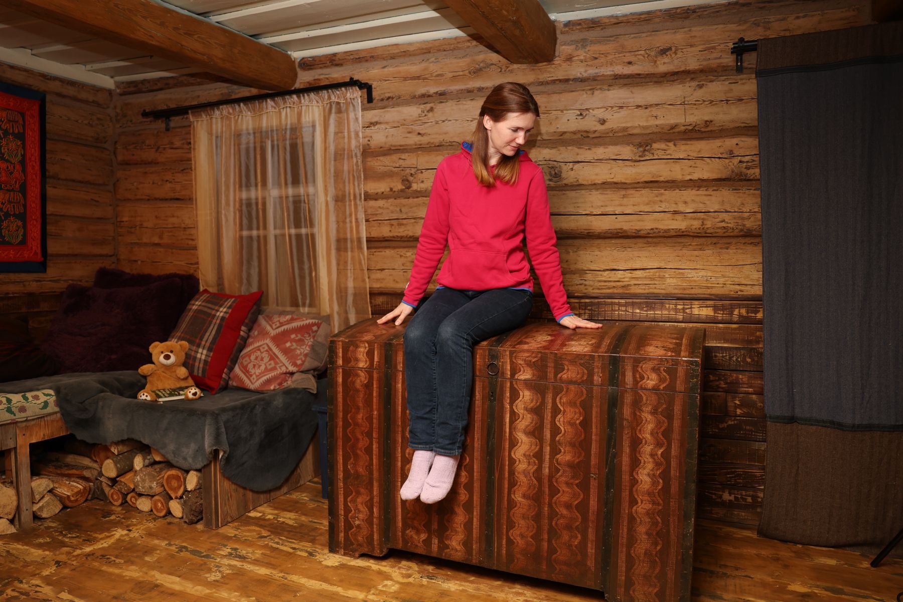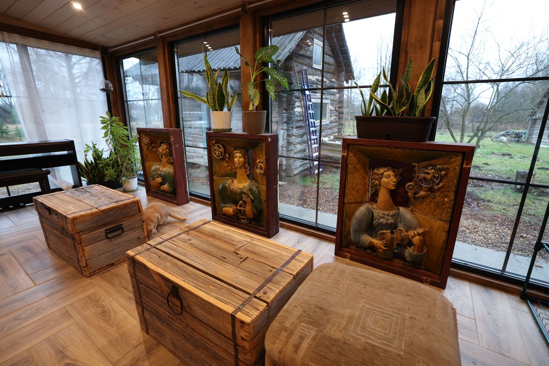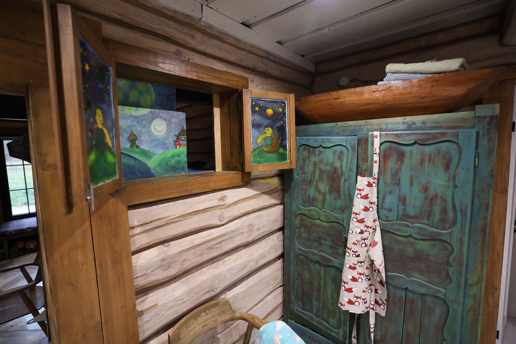 В прихожей пахнет деревом, печкой и дровами. В интерьере все продумано до мелочей – современные предметы гармонично сочетаются со стариной: подушки, сшитые вручную, рисунки прямо на стенах, сундуки, встроенные лавки...