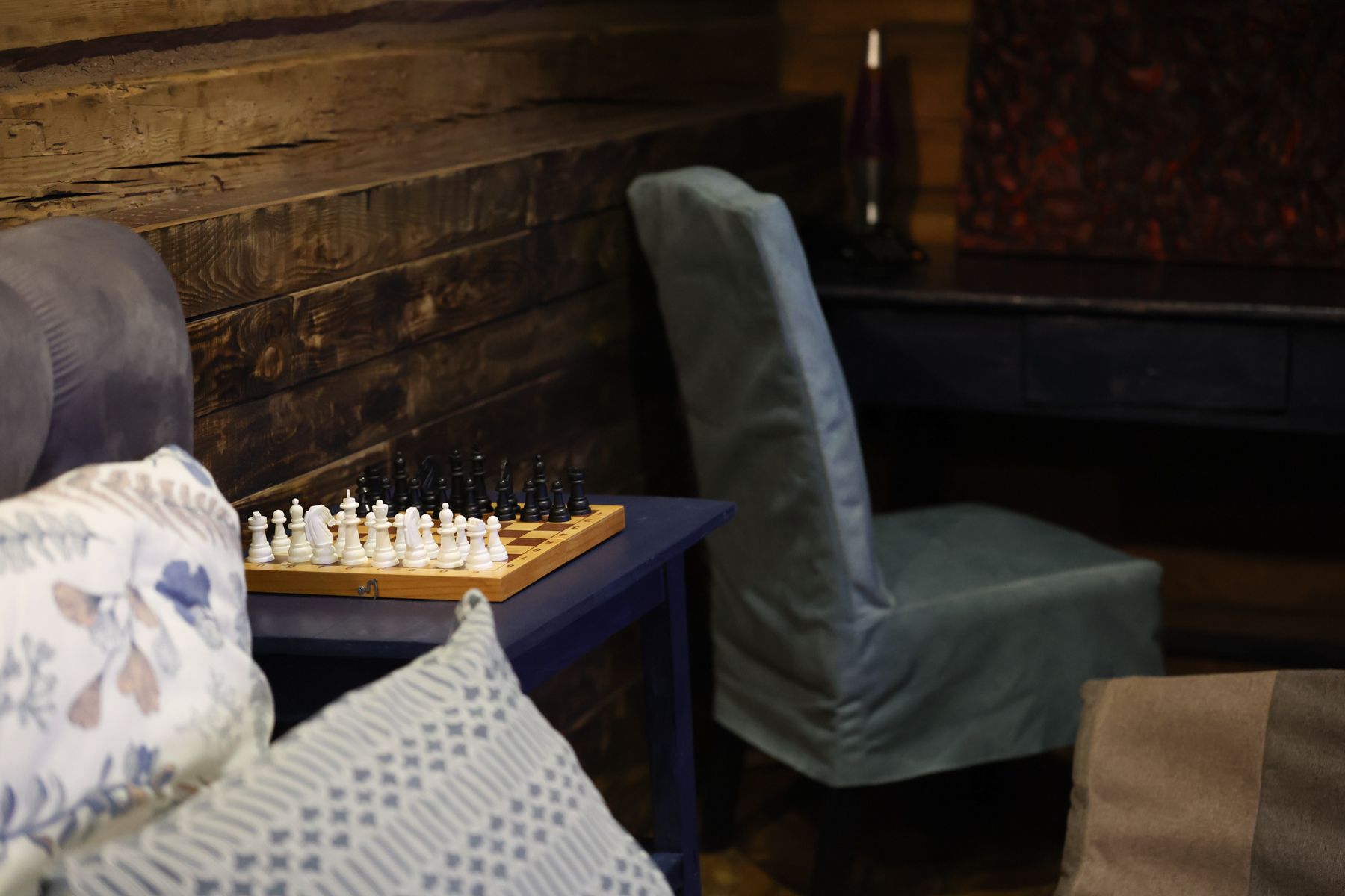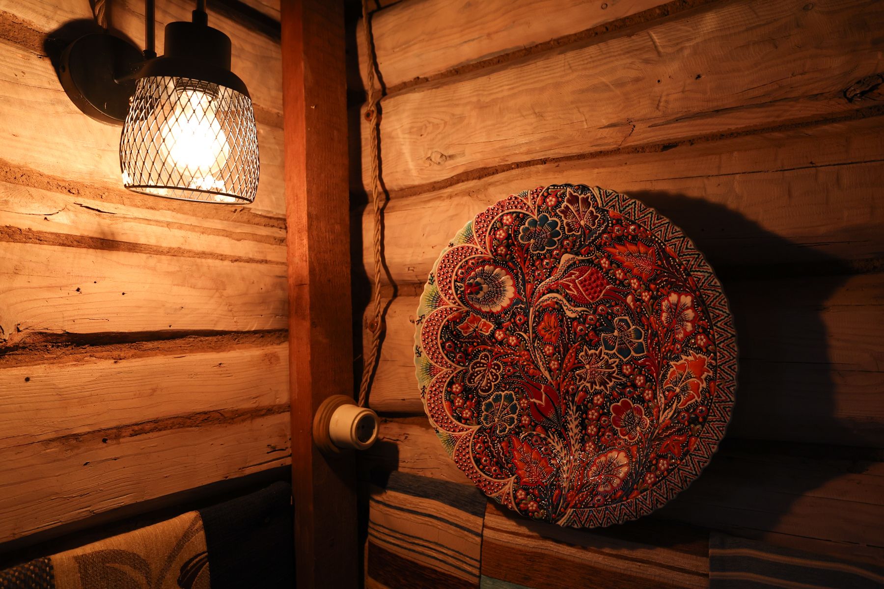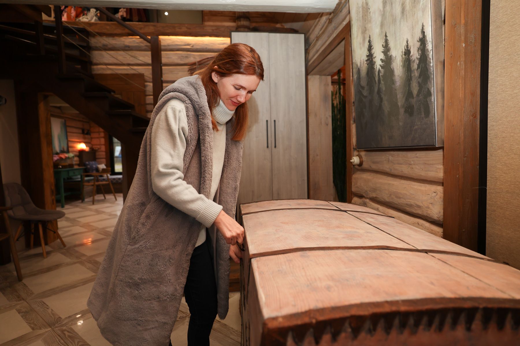 В прихожей пахнет деревом, печкой и дровами. В интерьере все продумано до мелочей – современные предметы гармонично сочетаются со стариной: подушки, сшитые вручную, рисунки прямо на стенах, сундуки, встроенные лавки...